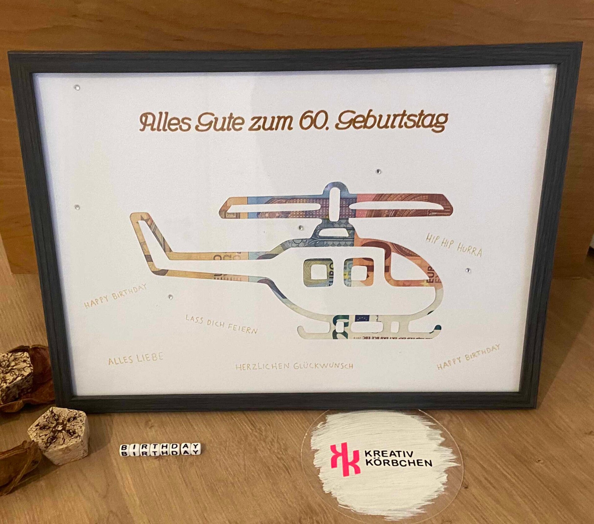 Du suchst ein kreatives und stilvolles Geschenk zum Geburtstag? Der Bilderrahmen mit dem Hubschrauber ist eine wunderschöne Möglichkeit, Geld liebevoll zu verschenken.