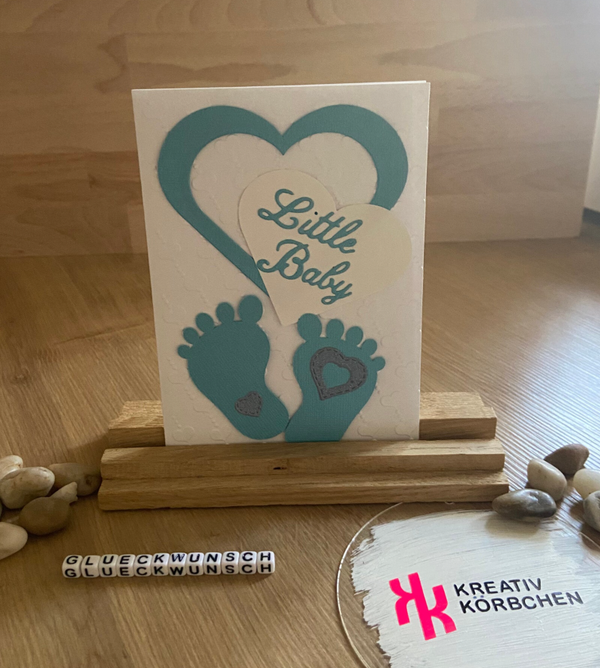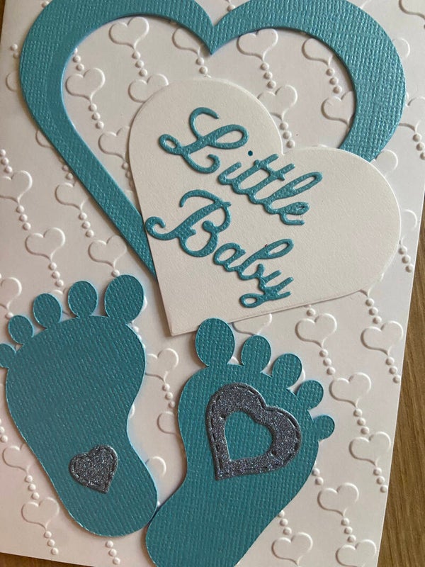 Die kleine süße Füße sind aus blauer Pappe ausgestanzt und auf ein weißen geprägten Herz Hintergrund platziert. Verziert wurde das Motiv noch mit dem kleinen Herzen und dem Schriftzug "Little Baby".