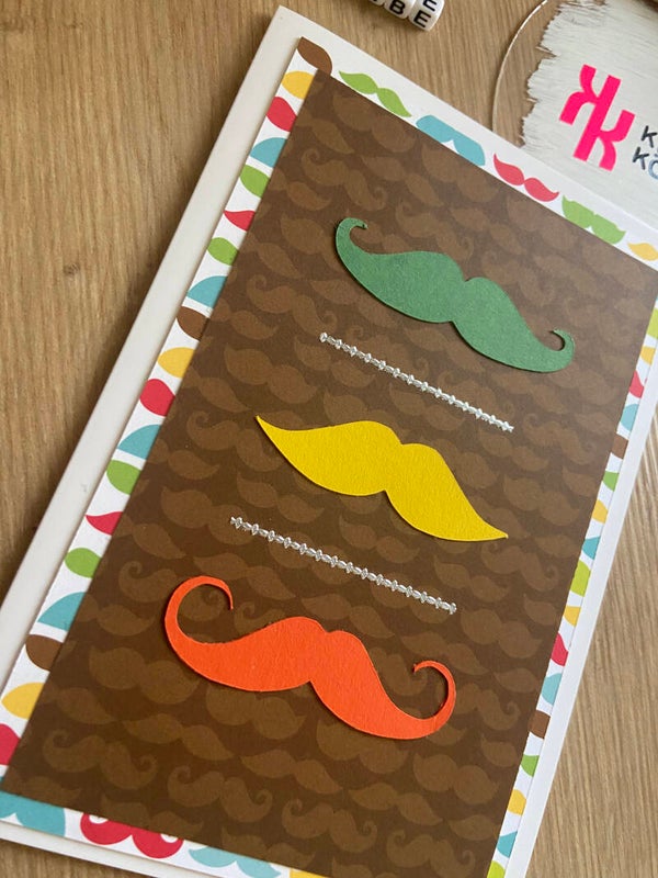 Die Glückwunschkarte ist perfekt für einen Mann mit Bart, der es manchmal auch gerne bunt mag. Als Hintergrund wurde die bunte Seite mit den Bärten gewählt. Um einen interessanten Effekt zu erzielen, habe ich das Papier gedreht und die braune Seite mit den Bärten verwendet. Um die Farbtöne des Hintergrunds aufzugreifen, habe ich drei bunte Bärte in den Vordergrund gesetzt. Die Karte wurde zusätzlich mit zwei silbernen Linien verziert.