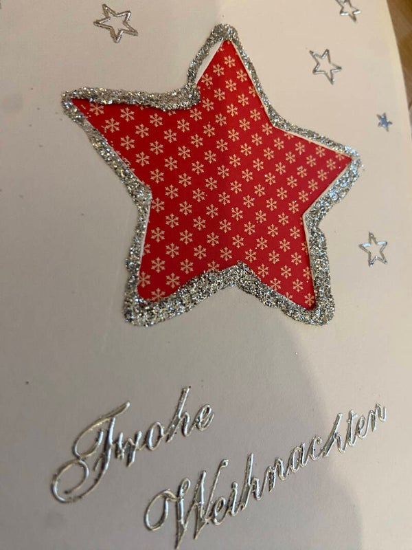 Diese schlichte, aber schöne Weihnachtskarte ist mit einem roten Stern und silbernen Glitzer-Details gestaltet. Der Schriftzug „Frohe Weihnachten“ funkelt dezent und macht die Karte zu einem liebevollen Gruß zur Weihnachtszeit. Die kleinen Sternchen drumherum runden das Design ab.